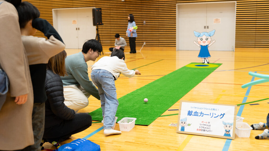 ー献血カーリングは、カーリングのストーンに見立てたボールを投げ、ハウス(円)の中に止まった位置で点数を競うゲームです。